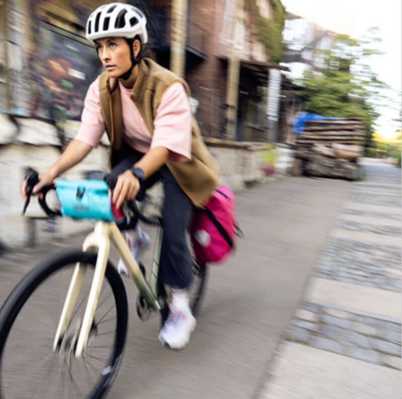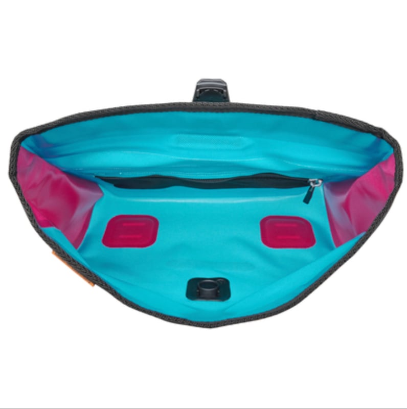 ハンドルバーには付属のO型ストラップで取付け、降車後はボディバッグに早変わり。マグネット式開口部は片手で簡単に開閉可能。内側メッシュジッパーポケット付。